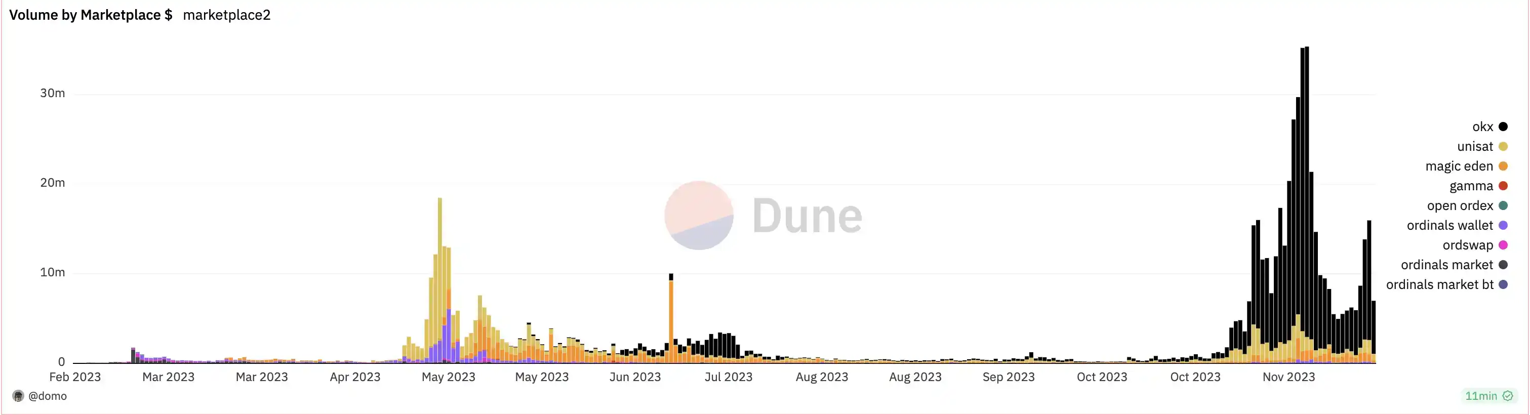 据 Dune Analytics 数据显示,比特币 Ordinals 铭文行情出现回暖趋势,昨日主流平台的交易量已上升至约 1594 万美元,相比 11 月 26 日 494 万美元的近日低点,涨幅超过 200%。