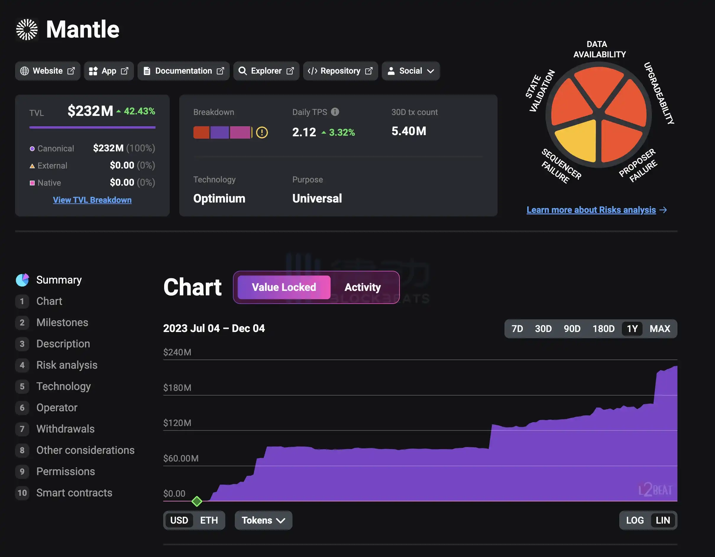 据 L2BEAT 数据显示,以太坊 Layer2 网络 Mantle 总锁仓量(TVL)达 2.32 亿美元,7 日涨幅 42.43%。 此前报道,Mantle 今日宣布在以太坊主网推出流动性质押协议 Mantle LSP。
