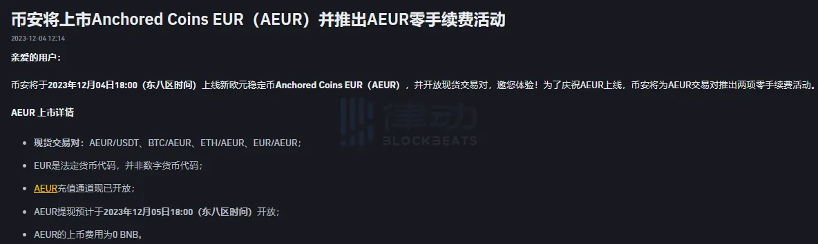 据官方公告,Binance 将于北京时间 2023 年 12 月 4 日 18:00 上线欧元稳定币 Anchored Coins EUR (AEUR),并开放现货交易对以及推出 AEUR 零手续费活动,新增现货交易对:AEUR/USDT、BTC/AEUR、ETH/AEUR 和 EUR/AEUR。