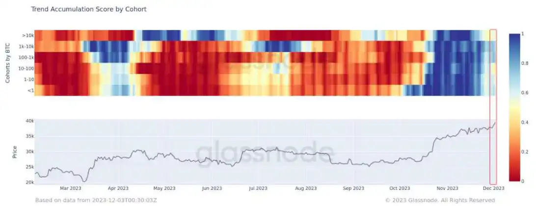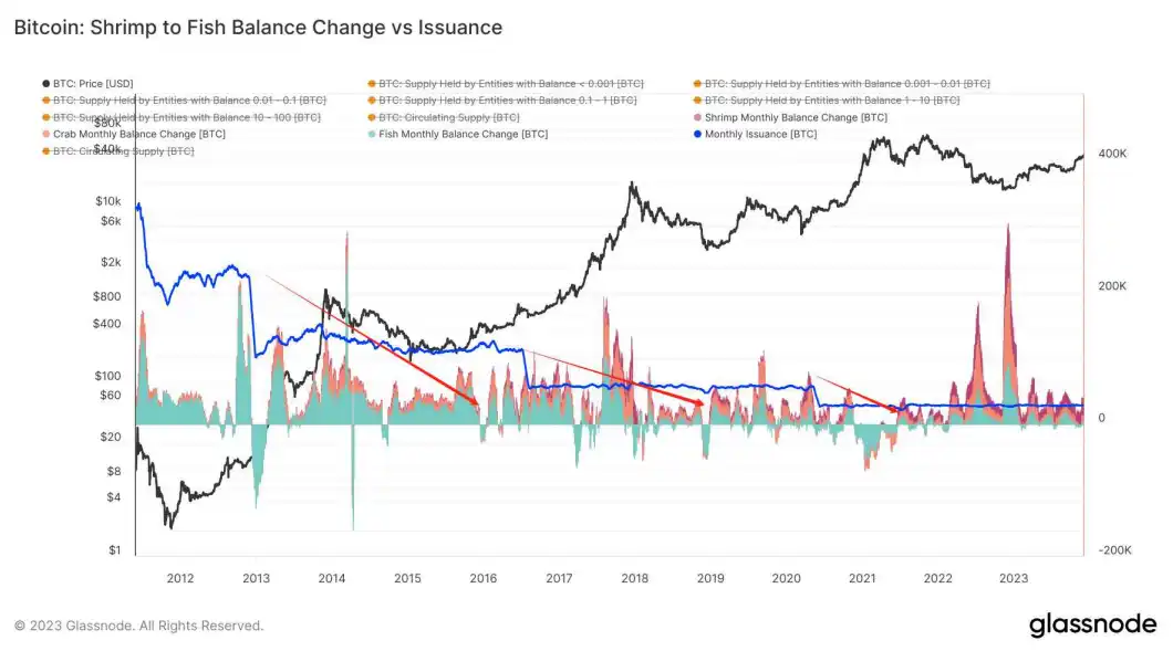 可以从宏观上链上数据来观察这⼀现象, 除了 2022 年下旬的极端现象,整体巨鲸的抛压量从历史上这些年度来看是有所下降的。