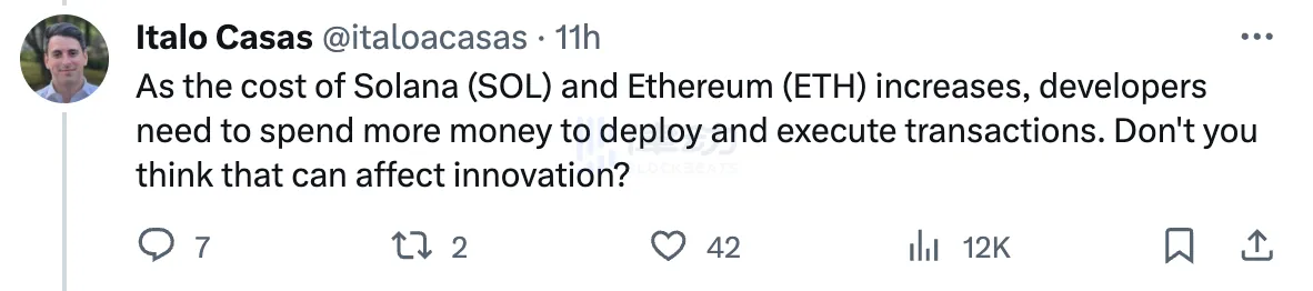Iron Forge Cloud 的 CEO Italo Casas(@italoacasas)表示:「随着 Solana (SOL) 和以太坊 (ETH) 成本的增加,开发者需要花费更多的钱来部署和执行交易。您不认为这会影响创新吗?」