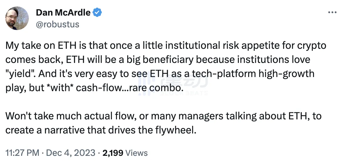 Case4Bitcoin 联创 Dan McArdle(@robustus)则指出,ETH 的人们如果想保持简单,就应该关注「收益」的东西,特别是对于潜在的 TradFi 兴趣:「一旦机构对加密货币的风险偏好有所回升,ETH 将成为一大受益者,因为机构喜欢『收益』。」