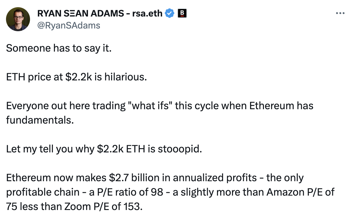 12 月 5 日,Bankless 创始人 Ryan Sean Adams(@RyanSAdams)在社交平台上发表长文指出:「有人说 ETH 的价格高达 2200 美元,实在是太搞笑了......ETH 尚未进入牛市。」与此同时,他指出以太坊的基本面很强,而当前的以太坊还尚未发挥出其真正的价值。