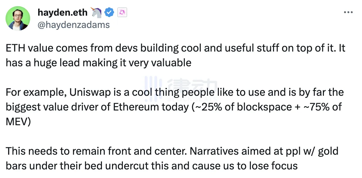 Uniswap 创始人 hayden adams(@haydenzadams)认为,ETH 的价值来自于开发者在其基础上构建酷炫且有用的东西。它具有巨大的领先优势,因此非常有价值。他还以 Uniswap 为例,表示「Uniswap 是人们喜欢使用的一个很酷的东西,并且是迄今为止以太坊最大的价值驱动因素(约 25% 的区块空间 + 约 75% 的 MEV)」。