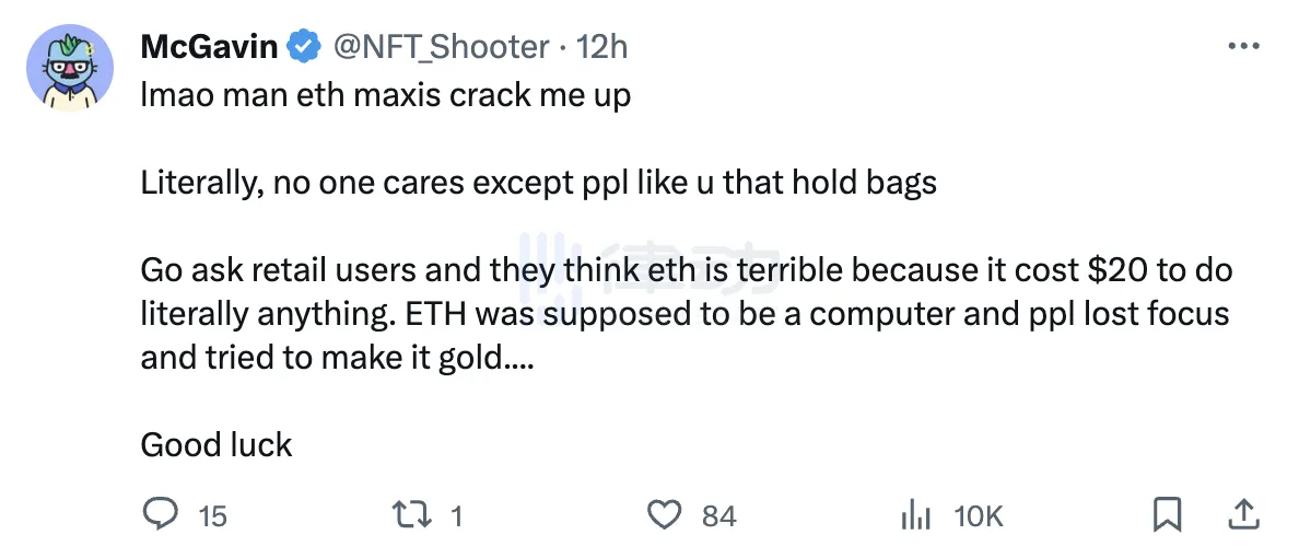 社区开发者 McGavin(@NFT_Shooter)指出:「去问零售用户,他们认为 ETH 很糟糕,因为做任何事都要花费 20 美元。ETH 应该是一台计算机,人们失去了注意力并试图将其变成黄金。」