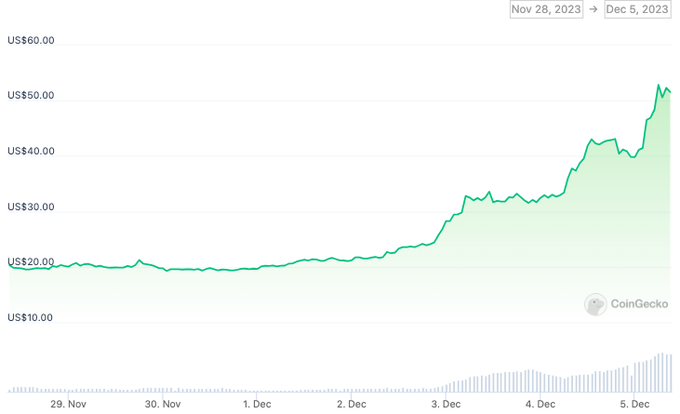 作为 Ordinals 的第一个 brc20 代币,ORDI 今晨冲高突破 54 美元,24 小时涨幅达 36.28%。周末还不到 30 刀的 ORDI,两天几乎快翻倍了。