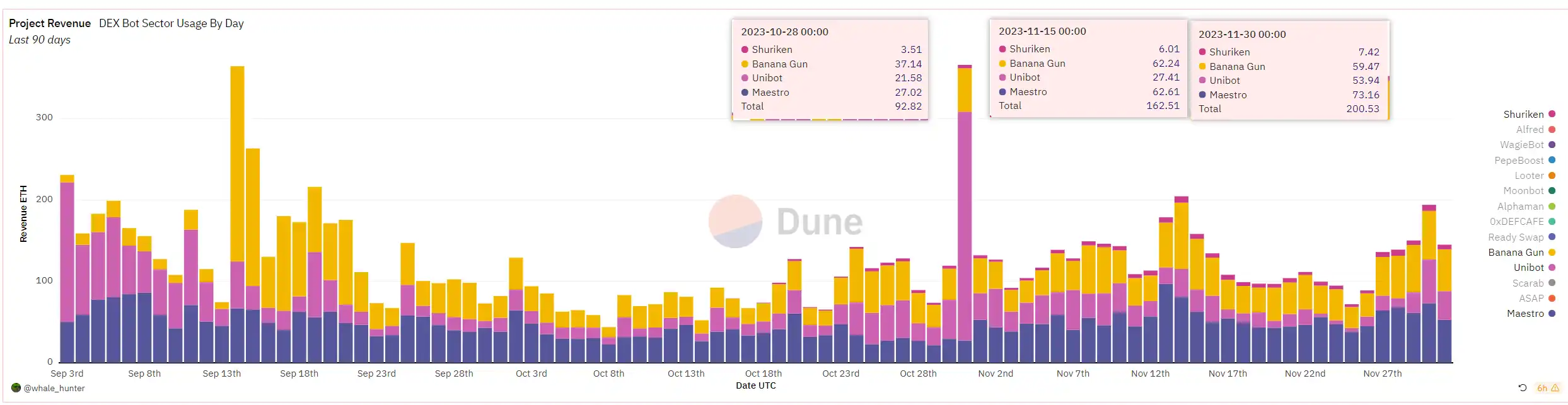 从收入来看,收入最高的一般都是 Maestro,其次是 banana 和 unibot。为什么说呢?因为三个协议的收入经常会有变化。其中变化最大的是 unibot。这主要原因是协议收入有两部分组成,一部分是用户使用 bot 交易支付的手续费,一部分是买卖项目代币交的 tax。比如说 unibot 在 10 月底的时候,出现了一次黑客事件,导致很多人恐慌抛售又有很多人抄底,unibot 代币交易量放巨量,tax 收入也就增加了好几倍。但是 unibot 协议本身并没有增加太多用户。