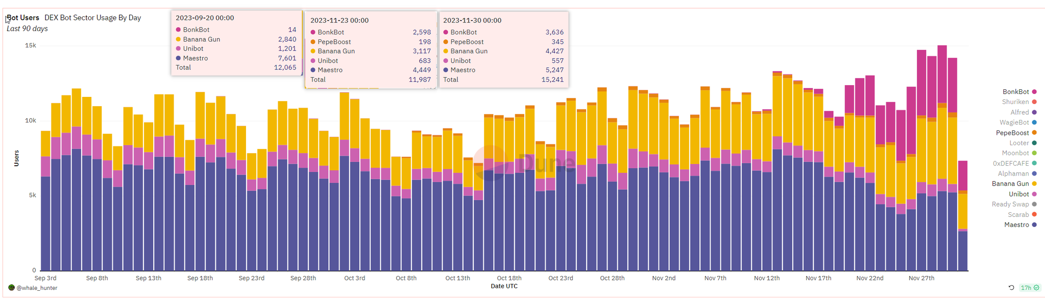 1)用户数量第一名的始终是 Maestro(未发币),第二名是 banana Gun,最近 2 周第三名是 BonkBot。而 Unibot 的用户数量比前三名相差好几倍,以 11 月 30 日为了,前三名的用户数量分别为 5247、4427、3636。那 Unibot 却只有 557,与第一名相差 9 倍之多。