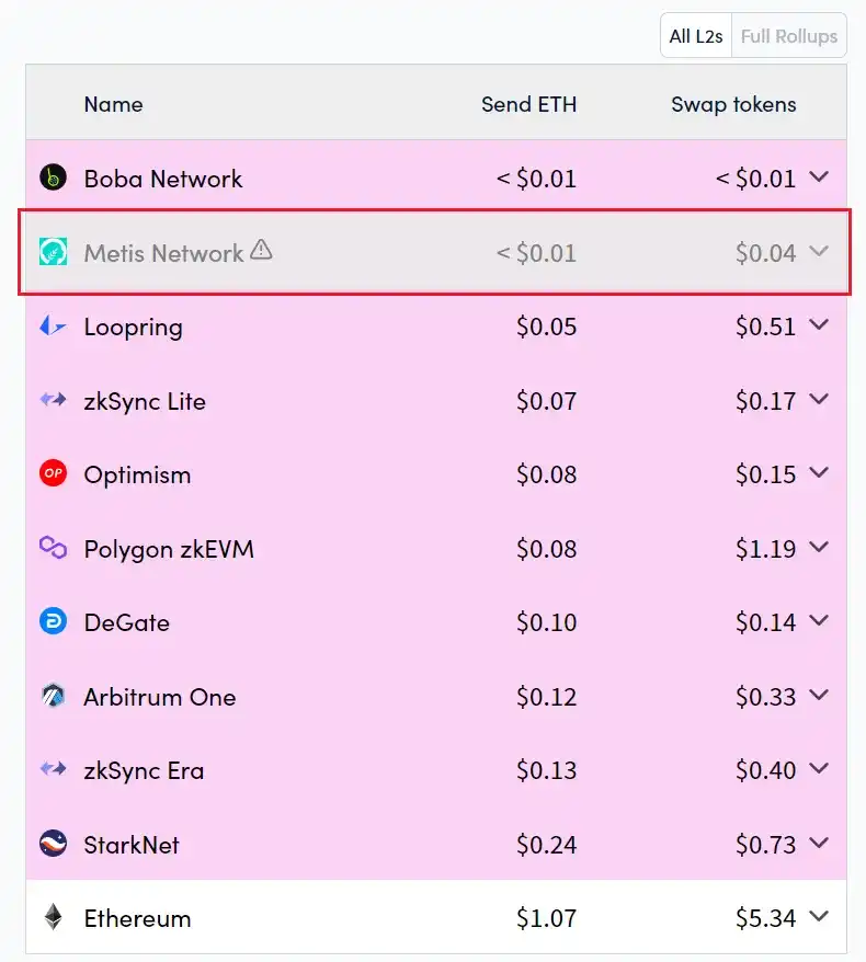 在所有的 layer2,Metis 的手续费是最低的。ETH 转账小于 0.01 刀,相对比 arbitrum 需要 0.12 刀,Optimsim 需要 0.08 刀,StarkNet 更是需要 0.24 刀。代币交易只需要 0.04 刀,仅次于 Boba 网络,而比 arbitrum 和 Optimsim 都要小好多倍。
