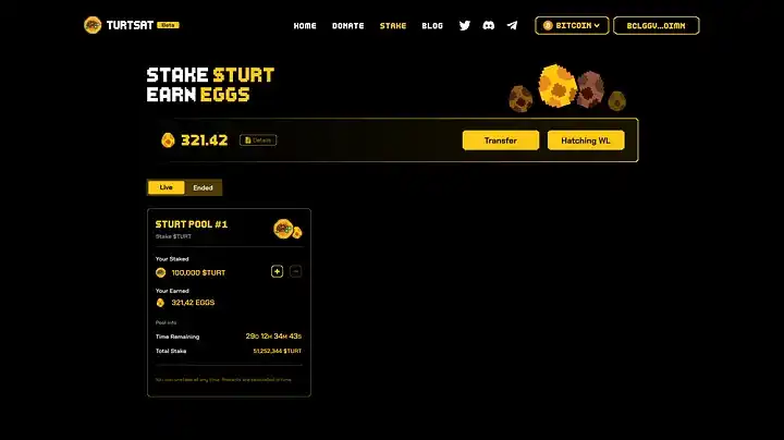 用户质押$TURT 将会获得「EGGS」,是 TurtSat 发行的全新资产,EGGS 的应用场景包括但不限于项目上线投票、直接兑换合作代币礼包等。