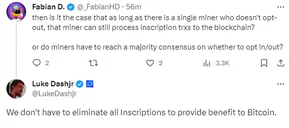 Bitcoin Core 开发人员 Luke Dashjr 在社交媒体上回答了若干质疑者的问题,其中某提问者表示:「是不是只要有一个矿工不选择退出,那该矿工就仍然可以处理区块链上的铭文交易呢?或者矿工是否必须就是否选择加入/退出达成多数共识?」