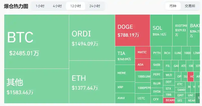 近 12 小时 ORDI 爆仓 1494 万美元,仅次于 BTC