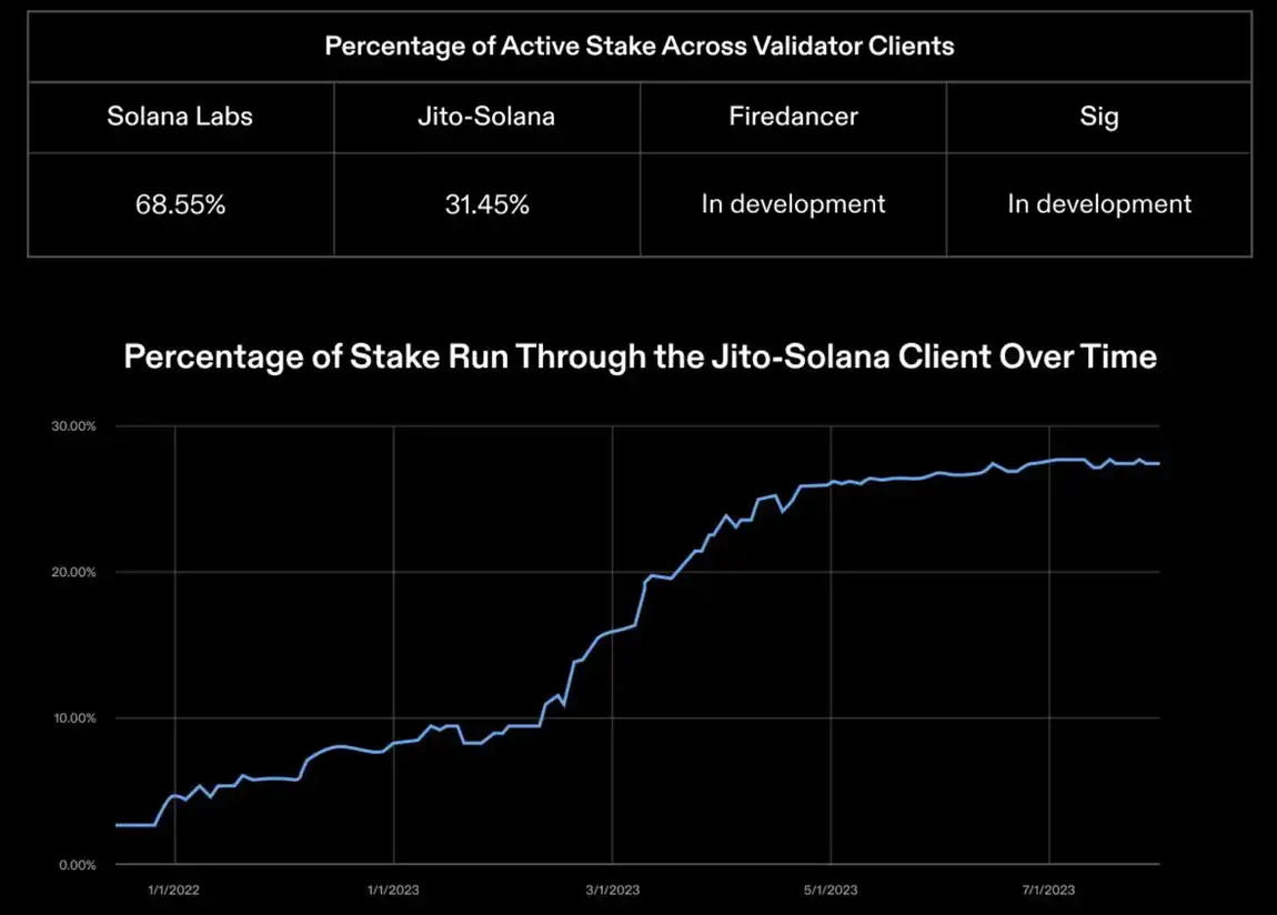 根据 Solana Foundation 推出的 Validator Health Report: October 2023 显示,目前约有 31.45% 的 Solana 验证节点选择使用 Jito Labs 推出的 Jito-Solana 验证器客户端,这也从侧面展示了 Jito Labs 在 MEV 领域的技术水平。