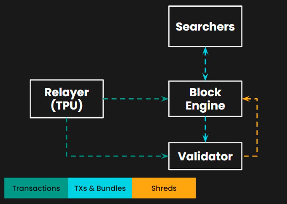 紧接着,Jito Labs 又陆续推出了优化 MEV 提取与分发的 Jito-Solana 验证器客户端、Jito Block Engine 等产品服务,成为了 Solana MEV 领域又一重要的基础设施服务提供商。Jito Block Engine 通过链下拍卖的方式链接网络中的中继器、搜索者和验证者,以此来解决 MEV 问题。