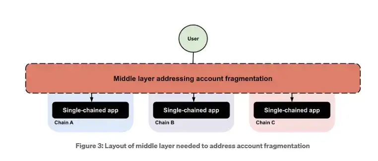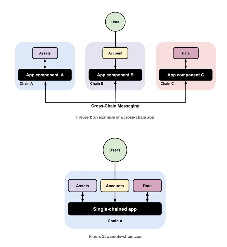 单链应用程序将其所有逻辑和流程限制在一个链上,与其他链没有通信。它们只与该链上的用户、资产和数据进行交互。另一方面,跨链应用程序在不同的链上有多个组件,这些组件通过消息传递协议进行通信。这种细微的架构差异使它们的互操作需求非常不同。跨链应用程序主要需要解决数据和流动性碎片化的互操作解决方案,所以现有的数十个消息传递协议和流动性网络对它们来说很有用。然而,单链应用程序主要需要解决账户碎片化的互操作解决方案。目前没有互操作解决方案可以很好地解决这个问题。