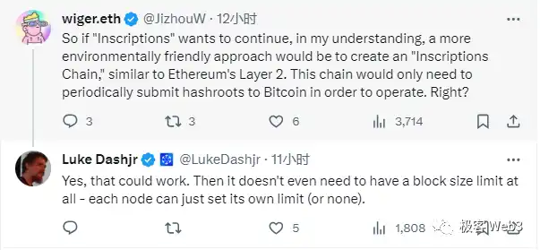 但有趣的是,Luke 虽然在部分言论中对 BRC-20 和各种铭文表达了消极态度,并表示如果新版的节点客户端代码发布并被广泛采用,届时 BRC-20 和 Ordinals 可能消失,但当其他人指出可以把比特币 Layer2 作为 BRC-20 新的归宿,以避免对比特币主网造成负担时,Luke 肯定了这种看法,并没有对 BRC-20 进行「意识形态」上的绝对否定。后来 Luke 本人更是直言:不是非要铲除所有铭文,才能给比特币网络带来益处。