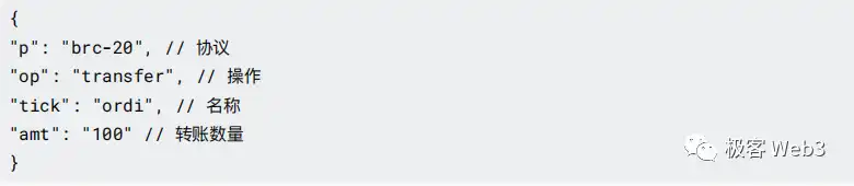 单从技术的角度去看,Ordinals 协议是⼀个为聪(SATS,⽐特币最⼩单位)编号的系统,或者说是以比特币 UTXO 作为存储媒介的衍生协议。 Ordinals 为每个聪赋予⼀个序号,再附加上额外的数据(文本、图片、代码等),使每个聪都变成独一无二的 NFT,这个过程称之为「铭刻」。BRC-20 在 Ordinals 的基础上,⼜推出了类似 ERC-20 同质化代币的发行⽅法。但 BTC 脚本并不图灵完备,⽆法实现以太坊那样复杂的智能合约系统。以最简单的 transfer 功能为例,基于 Ordinals 协议的衍生资产需要在脚本中写入如下内容: