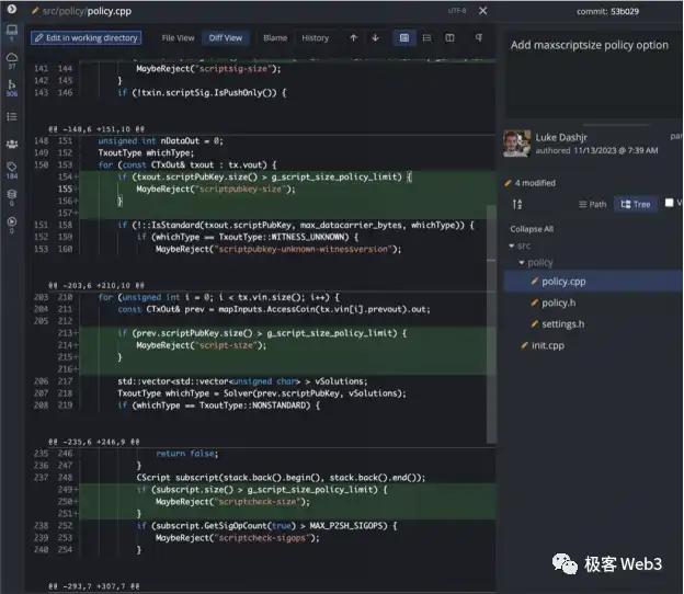 Luke 已经在 Bitcoin Knots 客户端中提交了 policy 的修改,在 Bitcoin Core 客户端中,他也想将相同的提交加⼊进去。而在 policy.cpp 中,他新增了⼀个名为 g_script_size_policy_limit 的参数,该参数在多个位置对脚本大小进行了限制。