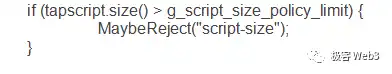 其中,g_script_size_policy_limit 默认值为 1650 Bytes,会限制许多 Ordinals 中使用的脚本,下图为⼀个 NFT 相关脚本的大小:
