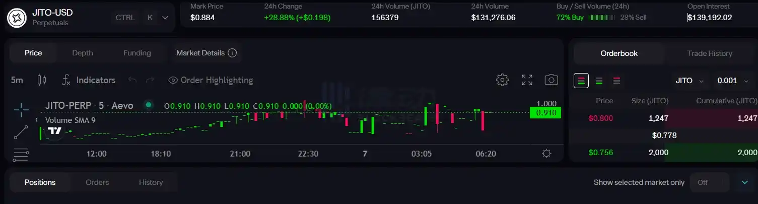 2. Aevo 上 JTO 期货价格暂报 0.884 美元,24 小时涨幅达 28.87%;