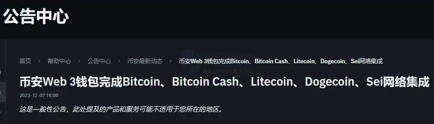 12 月 7 日,据官方公告,Binance Web 3 钱包已完成 Bitcoin、Bitcoin Cash、Litecoin、Dogecoin、Sei 网络集成。用户可以通过 Binance Web 3 钱包进行以上网络代币转账。