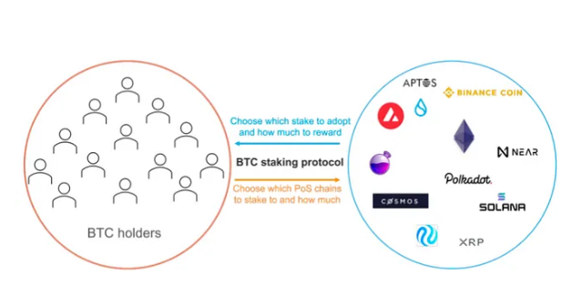 横向可以将 BTC 质押在不同的 pos 链来拓展 BTC 的可能性,让比特币可以在其他的 POS 链产生收益;