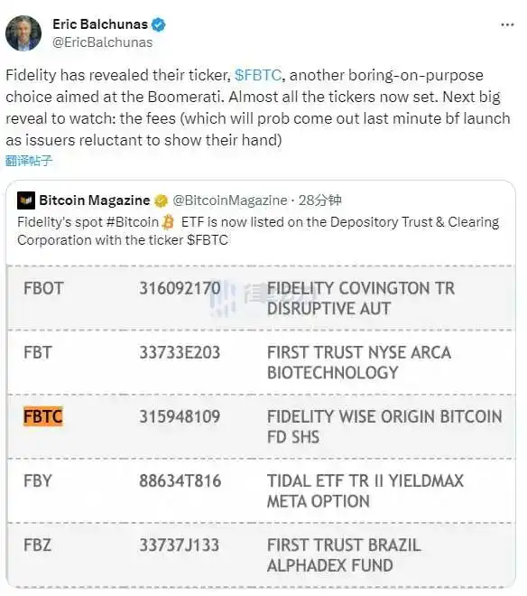 12 月 8 日,彭博分析师 Eric Balchunas 在其社交平台表示,富达现货比特币 ETF 代码已定为 FBTC,并已在 DTCC(美国存款信托与清算公司)上列出。