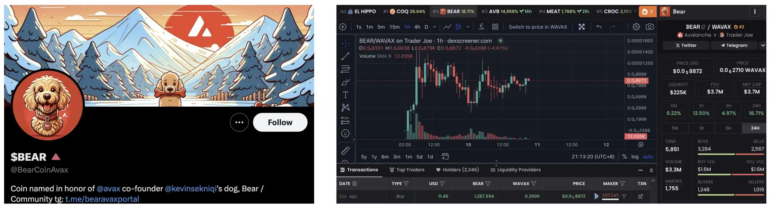 $BEAR 于 12 月 9 日发布,来源于 Avalanche 联合创始人 Kevin 将自己的狗发布在社交媒体后,因其名为「BEAR」,所有有用户发布了名为「BEAR」的 meme。