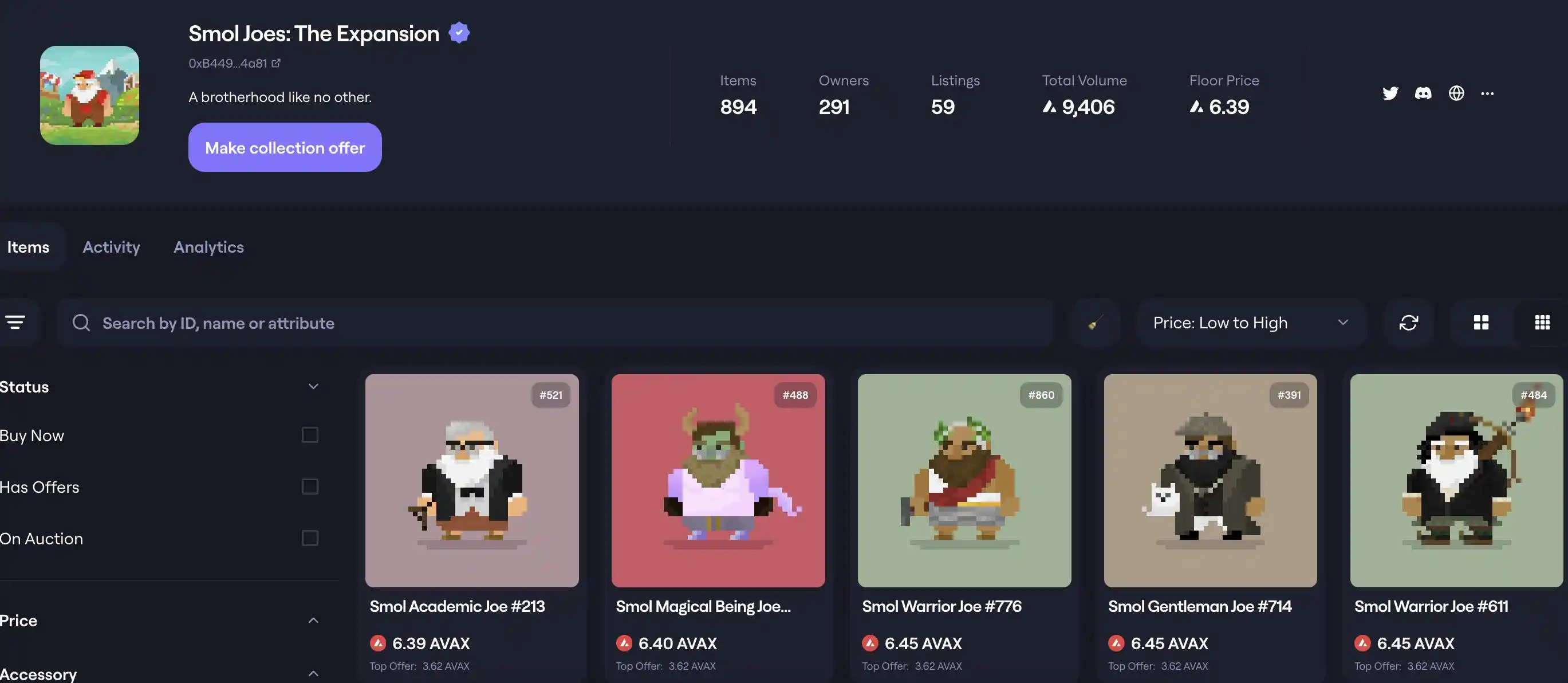 TraderJoe 团队同时也推出了自己的 NFT 平台 Joepegs,并拿到 FTX 与 Avalanche 的数百万美元融资。之后他们推出了多个 NFT 项目,但目前的发展核心只有 Smol Joes 和 Peon 两个项目。