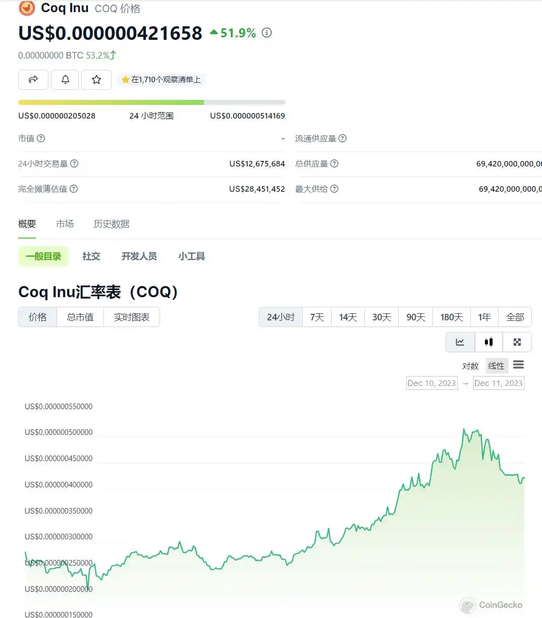 $COQ 是 12 月 8 日由 @WojakSatoshi 推出的 meme 项目,项目上线后,社区热情高涨,一直在上涨行情中,目前 FDV 28 million,已超过哈士奇。