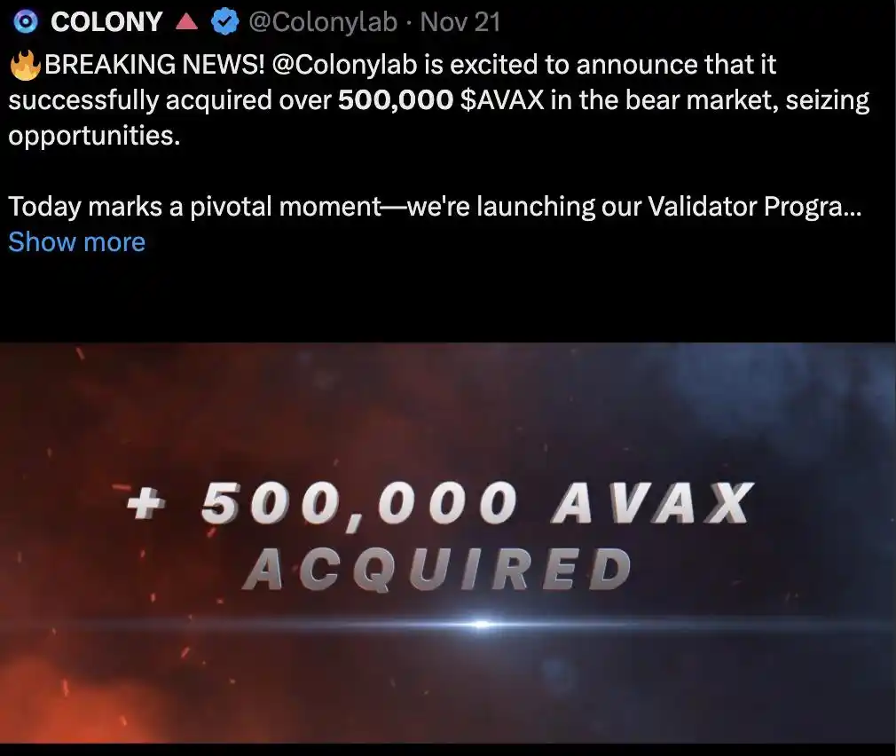 Colony 也是一个在 21 年就推出的项目,最近受到广泛关注的首要原因是,colony 推出了超过 1000 万美金的 Avalanche 生态基金计划,用于扶持 Avalanche 生态项目的发展。这得益于 Colony 之前在熊市一直在累积 $AVAX 代币,目前国库有超过 50w 枚$AVAX,当前价值约 1500 万美金。