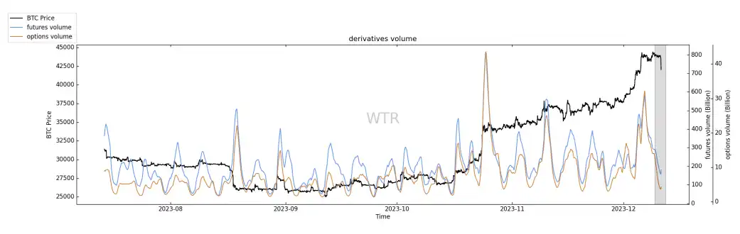 衍生品成交量在本周价格达到高点之后迅速回落,当前处于低位水平。
