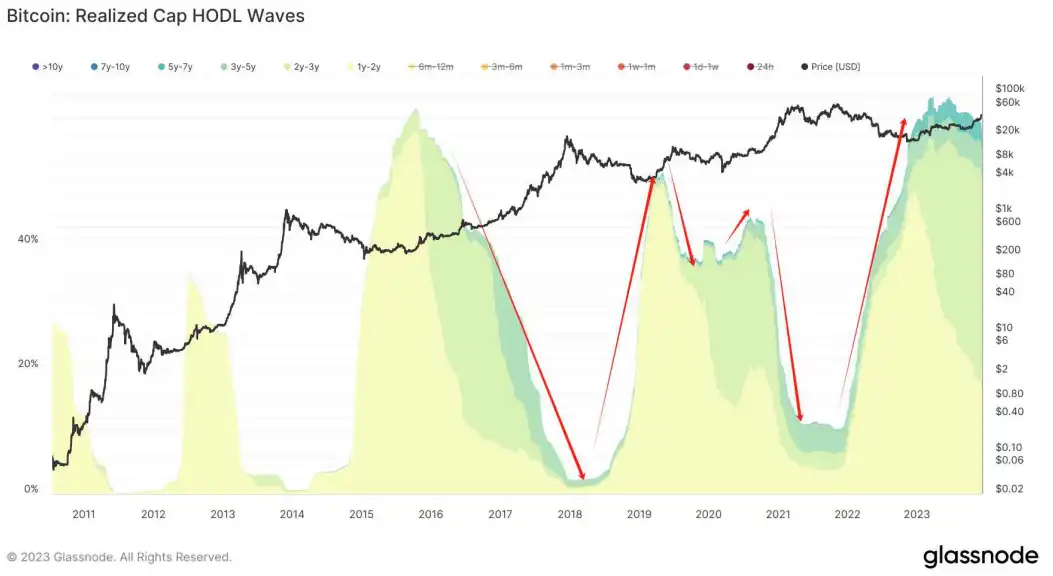 长期持仓者结构较为健康,且长期持仓者的结构在近⼀年来达到了 75% 的 80% 的时候市场的下跌已经 开始变缓甚至逐渐上涨。