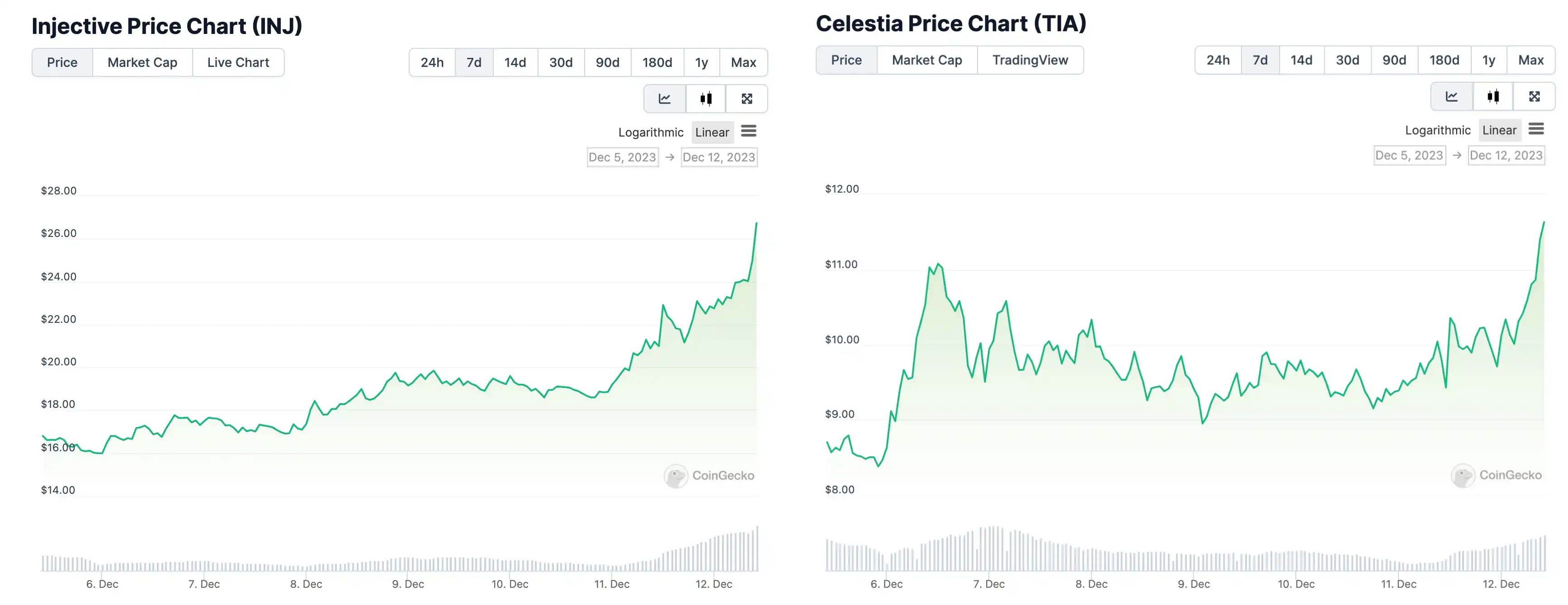 12 月 12 日,INJ 突破 25 美元,24 小时涨幅 20.02%,截至发稿前价格为 26.57 美元;而 TIA 上涨突破 11.5 美元,24 小时涨幅 14.9%,创历史新高,截至发稿前价格为 11.7 美元。