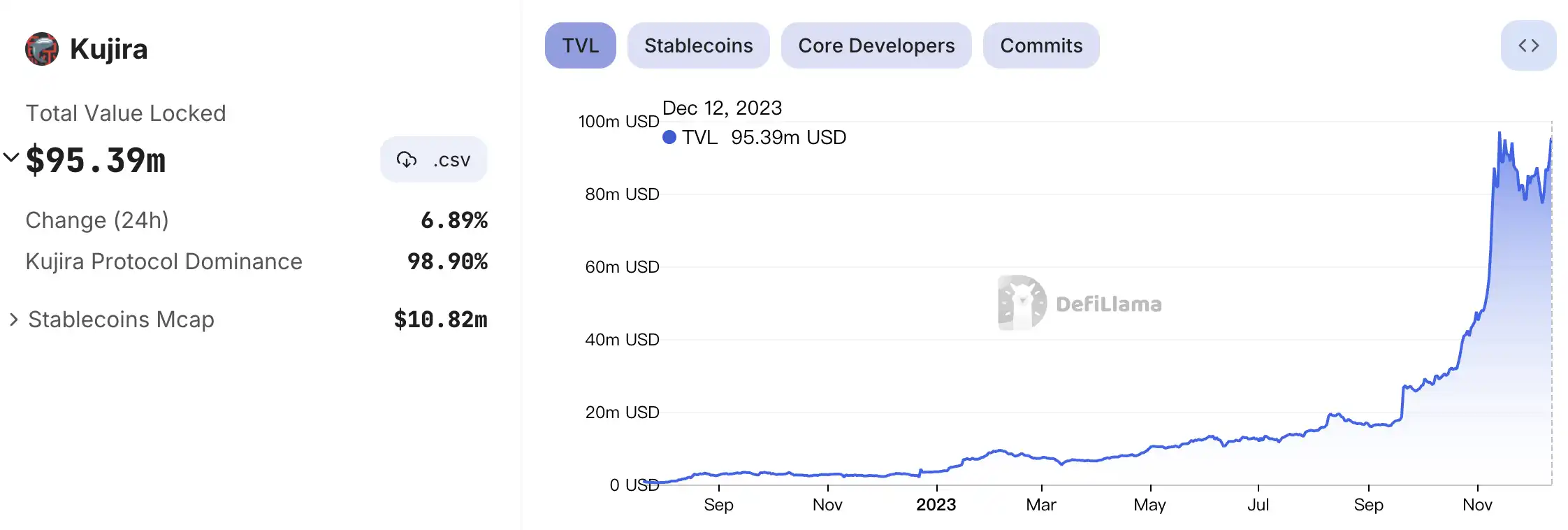 据 DeFillama 数据显示,Kujira 生态的 TVL 自 9 月开始大幅增长,截至目前,其 TVL 为 9539 万美元,近 7 日涨幅为 13.35%。而其代币 KUJI 目前价格为 4.26 美元,7 日涨幅达 28.9%。
