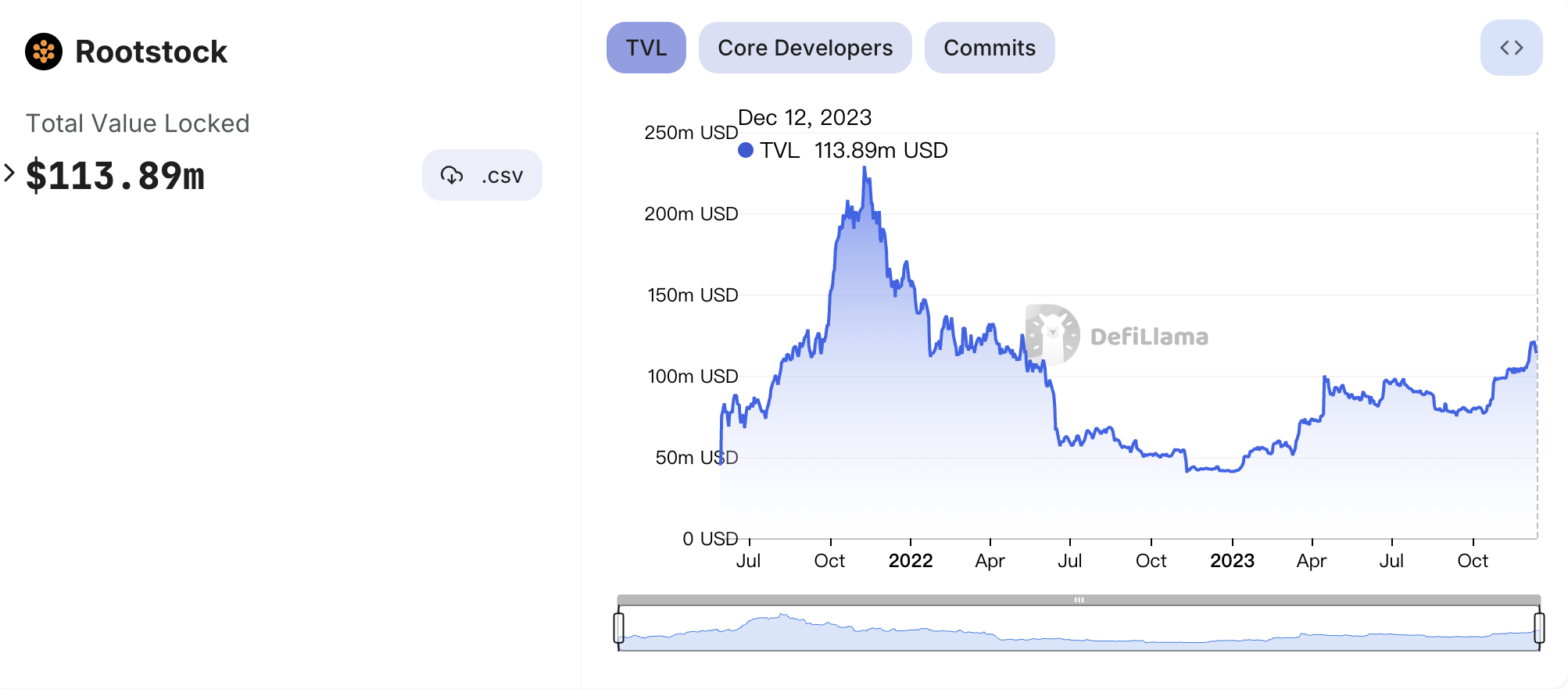 据 DeFiLlama 数据显示,截止发稿时,Rootstock 有 9 个协议。而按照 TVL 排名,Rootstock 在所有区块链中排名第 26,TVL 为 1.1389 亿美元。而在排名前 30 的区块链中,比特币生态相关的区块链,只有比特币和 Rootstock。