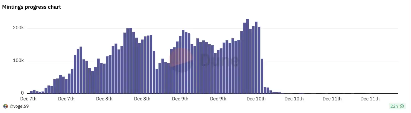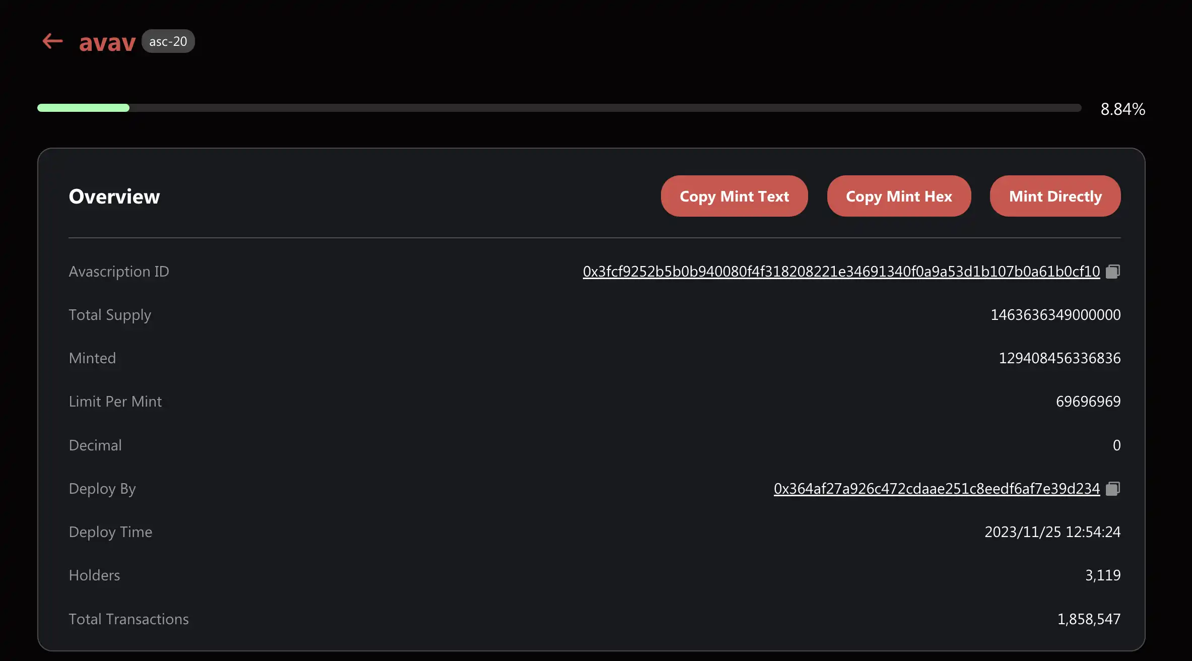 AVAV 是 Avalanche 铭文社区目前热度颇高的项目,总量 2100 万张,每张 69,696,969 个币,截至发稿前,mint 进度为 8.84%。