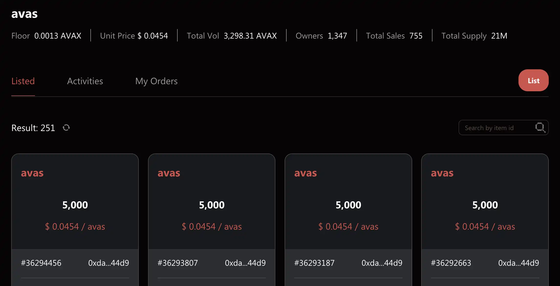 如前文所说,AVAS 是首批部署在 ASC-20 协议上的代币,于 12 月 12 日上线市场并开放交易。截至发稿前,AVAS 地板价为 0.0013 AVAX,24 小时交易量为 1501.76 AVAX,在 Avascriptions 上交易量排名第二,总市值为 954,405 美元。