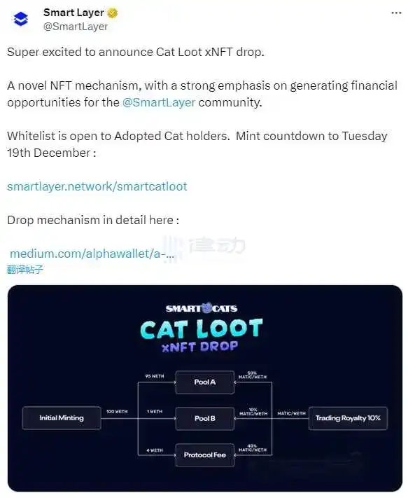 12 月 13 日,据官方消息,Smart Layer 推出 Cat Loot xNFT,白名单将对 Smart Cat NFT 持有者开放。 据悉,Cat Loot xNFT 包含 Smart Cat Toys,用户可以在任何时候销毁以换取 WETH。目前白名单申请已开放。白名单用户可以从 12 月 19 日开始铸造。