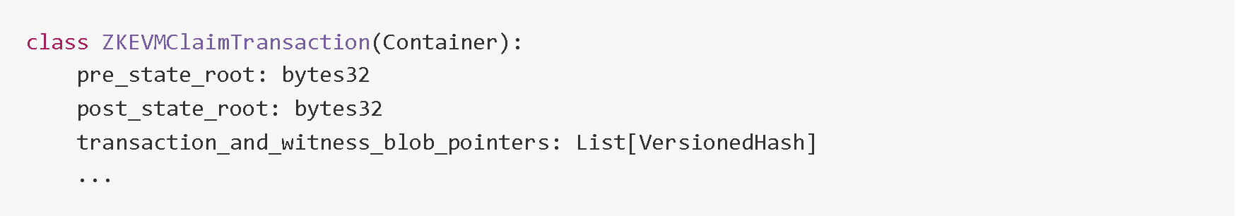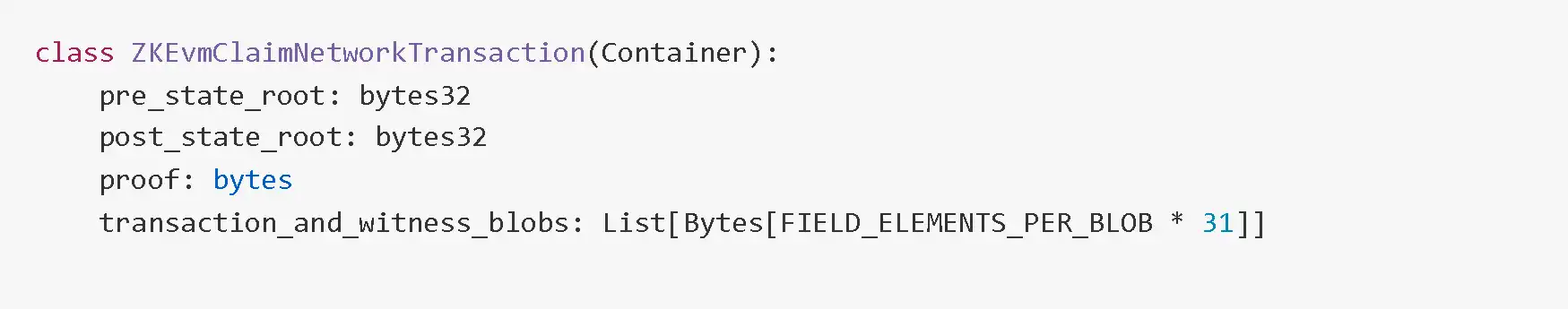类似于 EIP-4844 Blob 交易,我们引入了一种包含 ZK-EVM 声明的新交易类型: