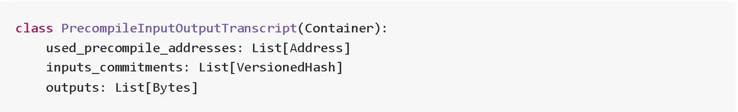 EVM 执行将被修改如下。数组 inputs 将被初始化为空。每次调用 used_precompile_addresses 中的地址时,我们将 InputsRecord(callee_address、gas、input_calldata)对象附加到 inputs,并将调用的 RETURNDATA 设置为 outputs[i]。最后,我们检查 used_precompile_addresses 总共被调用了 len(outputs) 次,并且 inputs_commitments 匹配生成的 blob commitments 到 inputs 的 SSZ 序列化的结果。暴露 inputs_commitments 的目的是为了方便外部 SNARK 证明输入和输出之间的关系。