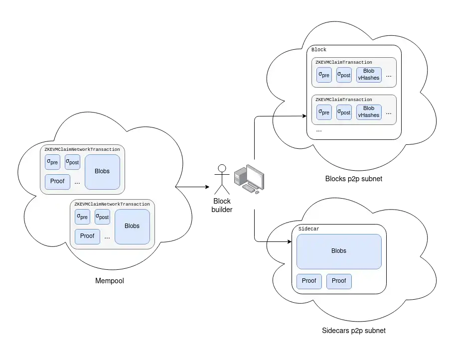 在这里有一个哲学性的注记,即区块执行本身可以被视为仅是需要与 ZKEVMClaimTransaction 对象中提供的(σpre,σpost,Proof)三元组之一一起检查的。因此,用户的 ZK-EVM 实现可以替换其执行客户端;执行客户端仍将被(i)证明者和区块构建者使用,以及(ii)关心索引和存储数据供本地使用的节点使用。