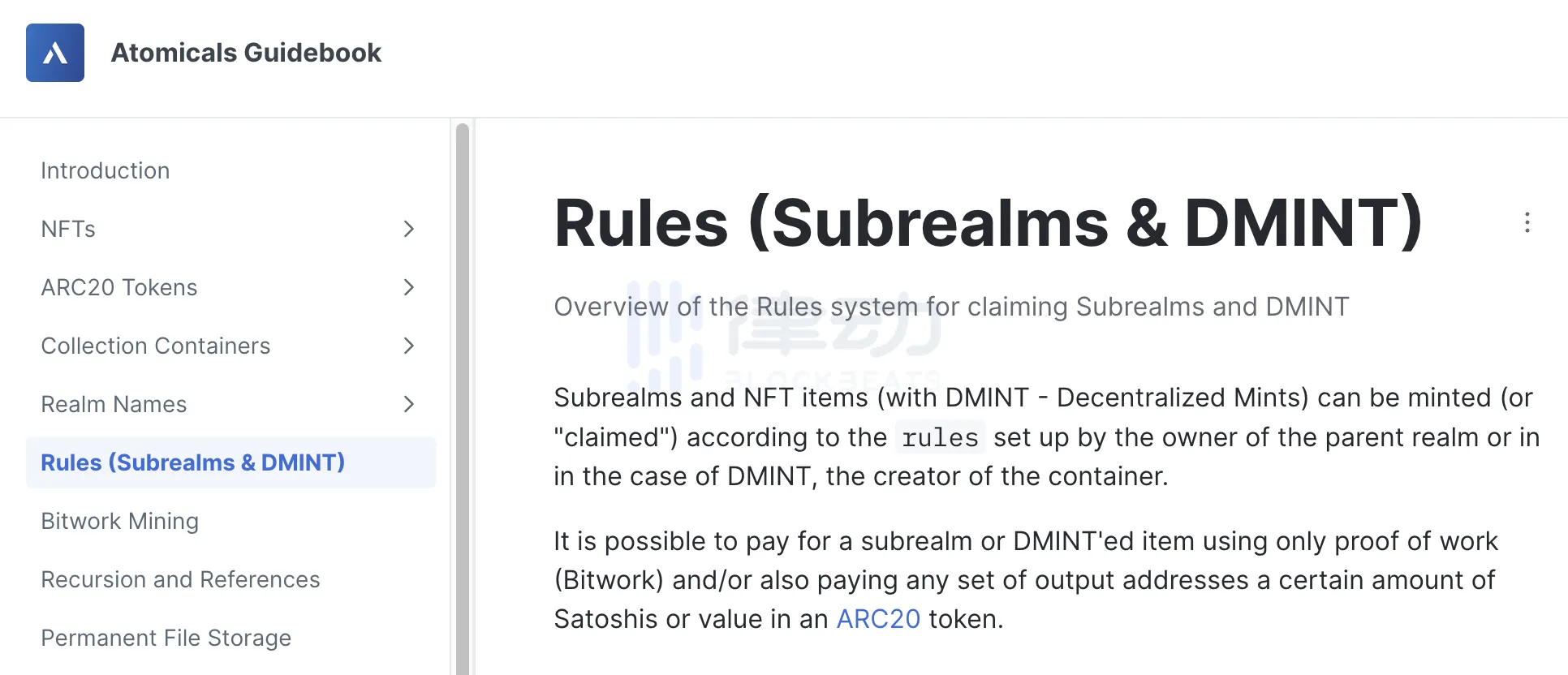 12 月 12 日,Atomicals Protocol 发布了 Subrealms 和 DMINT 的交易规则,允许 Realm 所有者通过 bitwork 或 ARC-20 代币付款来铸造 Subrealms,帮助用户轻松实时创建高级规则和支付,作为领取 Subrealms 和 DMINT NFT 物品的条件。
