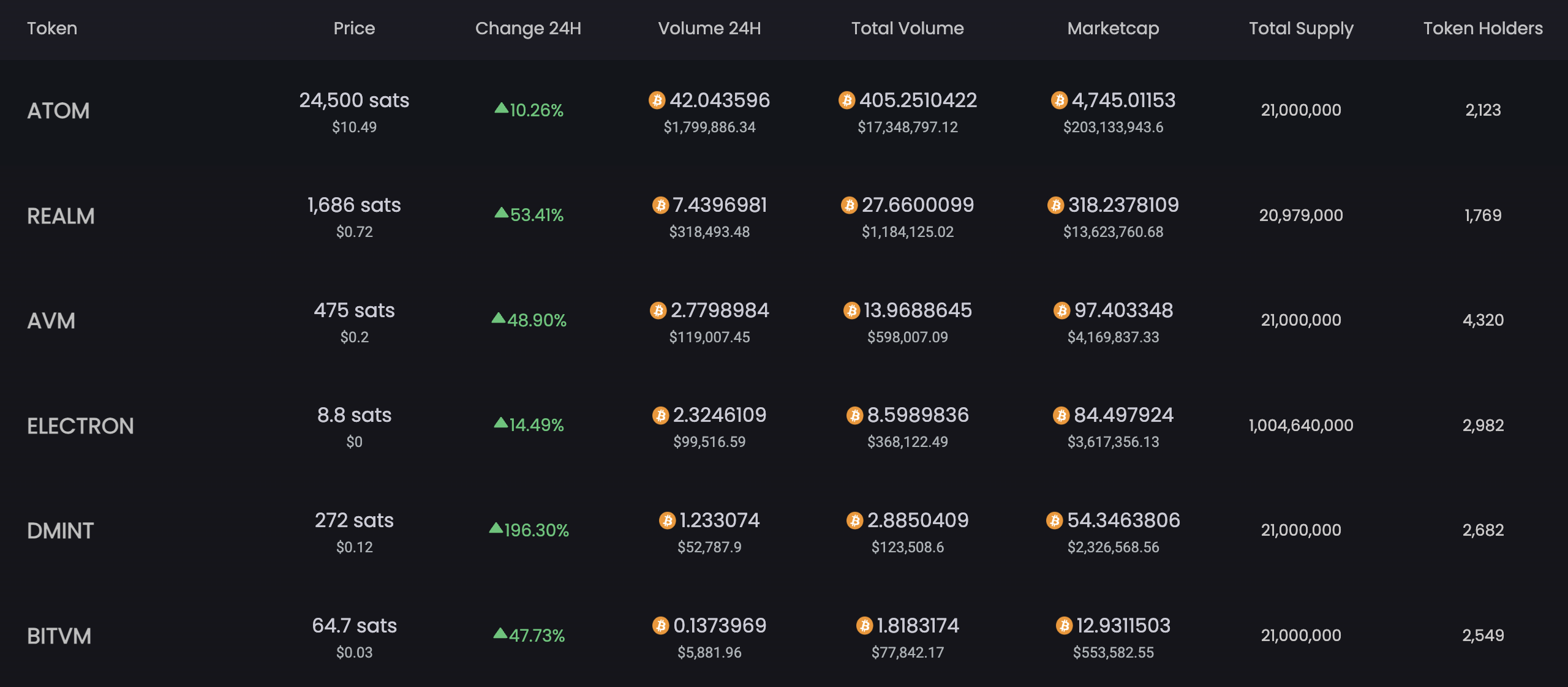 其中 DMINT 报价 0.12 美元,24 小时涨幅达 196.3%; BITVM 报价 0.03 美元,24 小时涨幅达 47.73%; REALM 报价 0.72 美元,24 小时涨幅达 53.41%; AVM 报价 0.2 美元,24 小时涨幅达 48.9%; ATOM 报价 10.49 美元,24 小时涨幅达 10.26%。