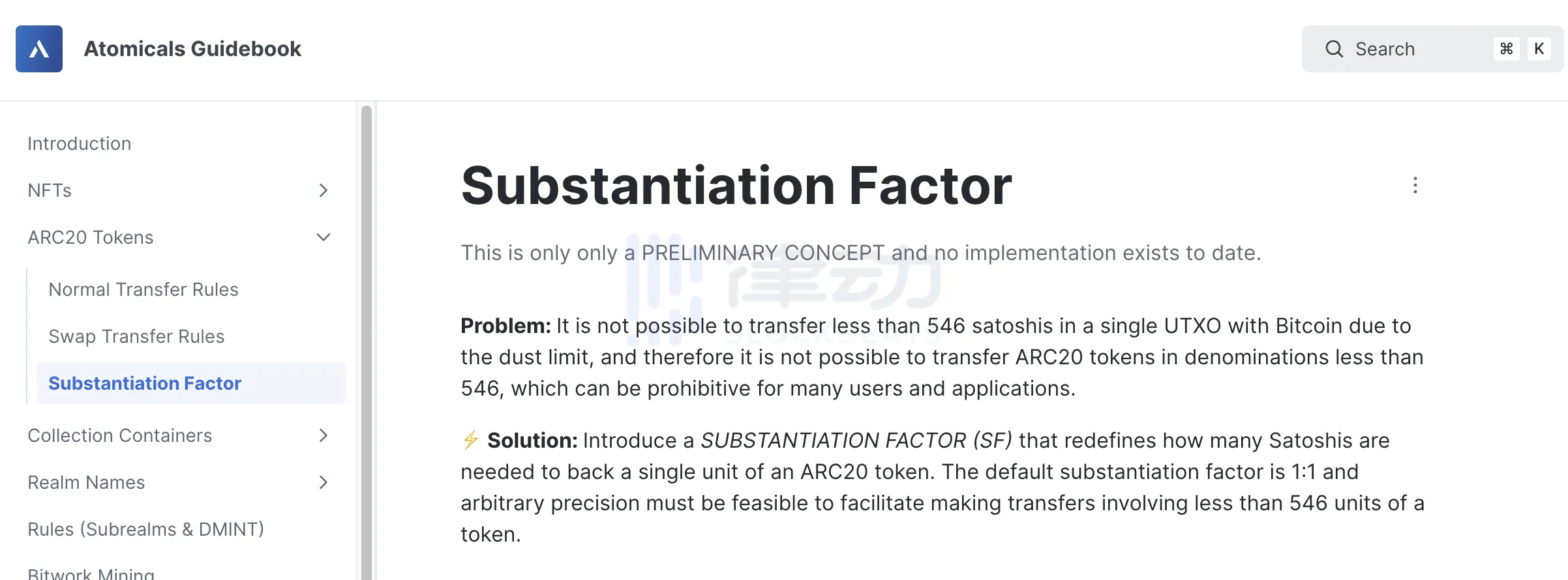 而 Atomicals Protocol 提出的方案通过引入「实质化因子」(Substantiation Factor,SF),重新定义了支撑单个 ARC-20 代币所需的聪数量,从而克服了这一限制。该方案的核心是允许代币持有者将他们的代币单位从 1:1 转变为 1:10、1:100 等更小的比例,实际上是「拆分」或「细分」他们的代币单位至任意精度。