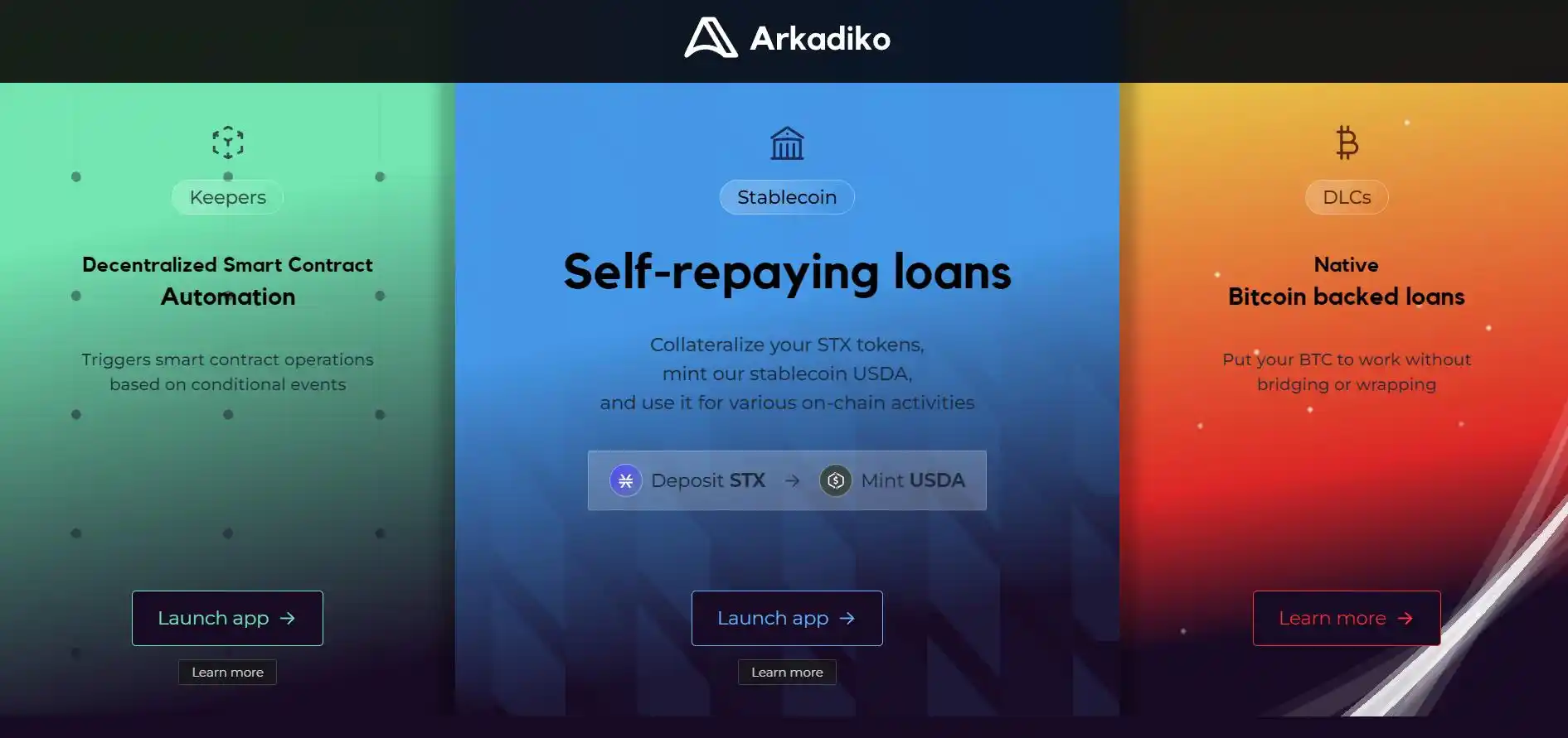 Arkadiko Protocol 是一个基于 Stacks 生态系统的去中心化流动性协议。它允许用户使用 Stacks 原生代币 $STX 作为抵押来铸造 Arkadiko 的自己的稳定币 USDA。这个项目的重点是为 Stacks 生态提供去中心化的稳定币,以增强生态系统的流动性和功能性。