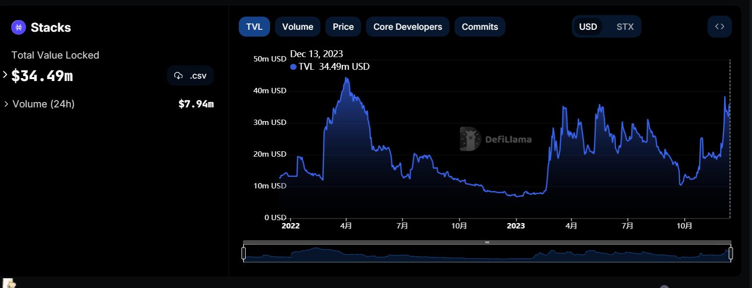 根据 DefiLlama 的数据,目前 Stacks 的 TVL 为$34.49M,相对于以太坊 L2,还有较大的上涨空间。