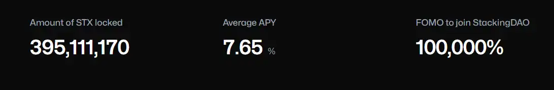 截至撰写本文时,已有将近 4 亿枚$STX 被质押在 StackingDAO,平均年化达到 7.65%。