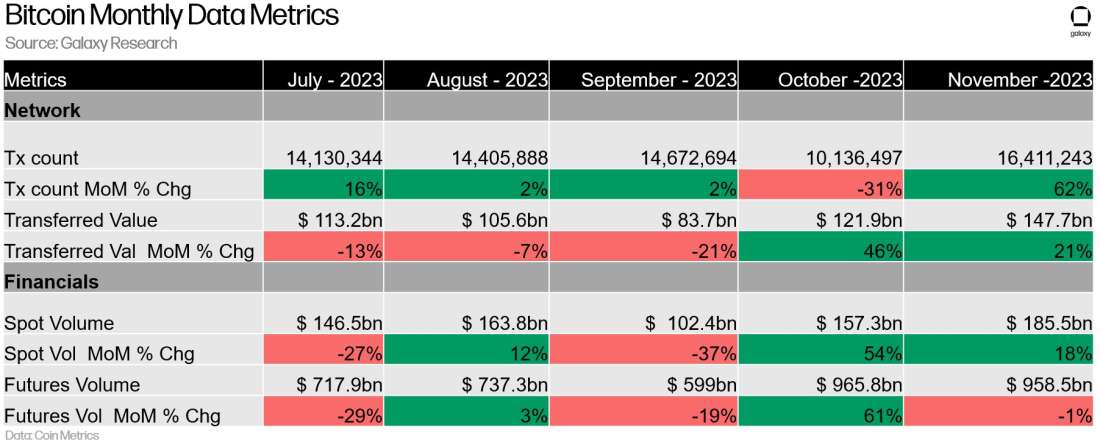 2023 年 11 月,比特币链上交易数量环比 (MoM) 增长 62%,这主要是由于 Ordinals 和 BRC-20。11 月份比特币转移的美元总价值超过 1470 亿美元,较上月大幅增长 21%。这一增长主要归因于以美元计价的 BTC 价格升值,但现货市场的 BTC 交易量也环比增长了 18%,而期货交易量则分别环比下降了 1%。