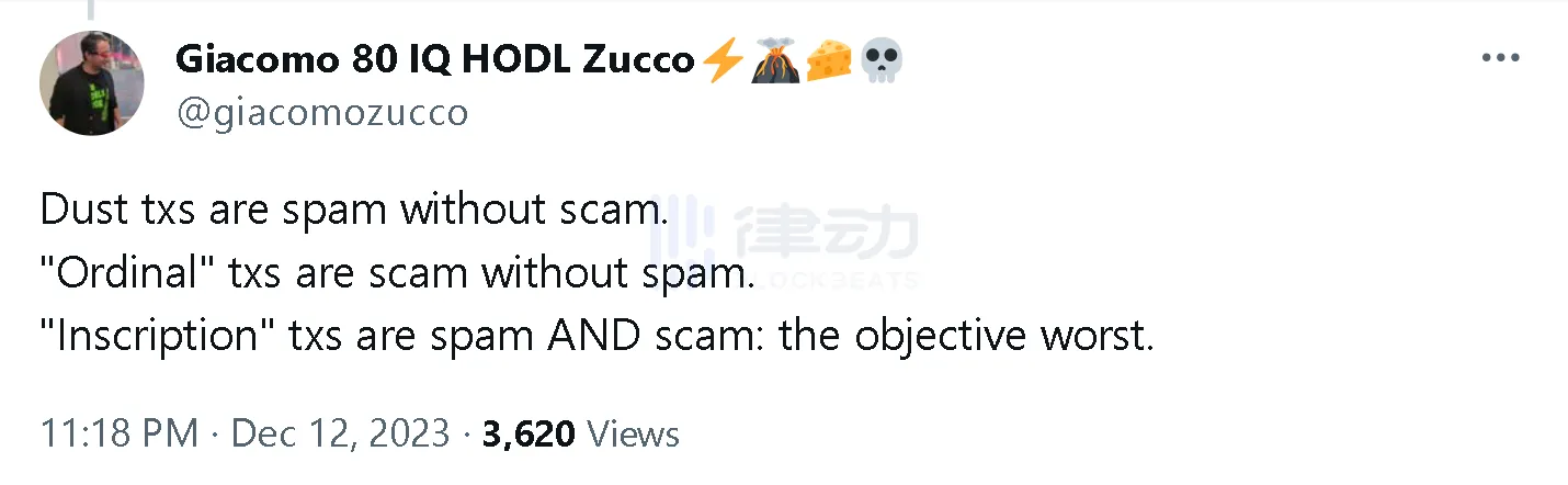 「Ordinals 交易是没有垃圾邮件的骗局。铭文交易是垃圾邮件和骗局,客观上是最糟糕的。」在最近一次相关的言论里,Giacomo Zucco 这么说道。